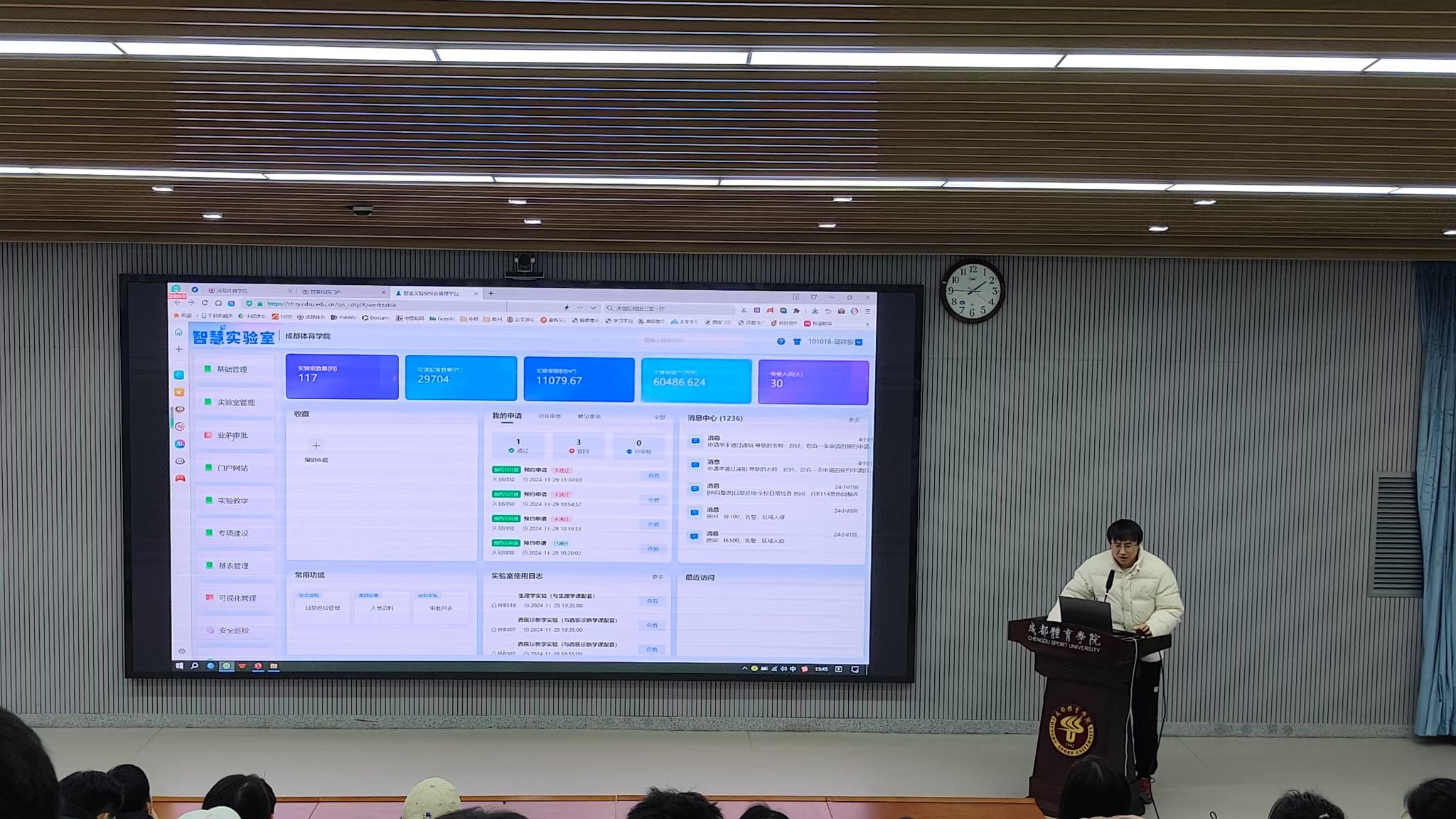 培训伊始,教务处实验管理处晁永鹏处长委托张嘉伟科长介绍学校东部新区校区新建1.3万平方米的综合实验大楼(怀贤楼)以及学校实验室安全建设的概况;并希望学院严格落实实验室准入制度,各位导师一定要对研究生同学开展实验前教育,进入实验室的人员要肩负起实验室安全的共同责任。教务处实验管理处邱祥俊老师介绍了学校实验智慧平台建设情况,并在线演示了实验智慧平台上“预约与开放”、“安全考试”、“安全学习”等多个模块的操作方法。
