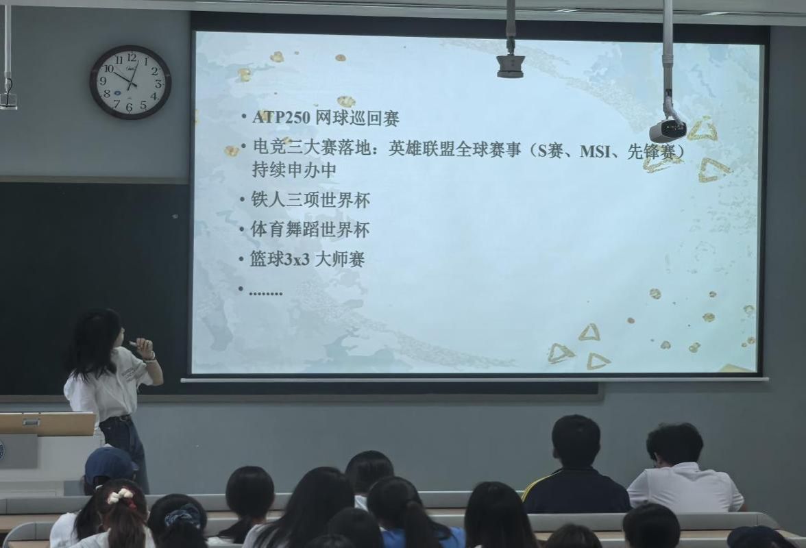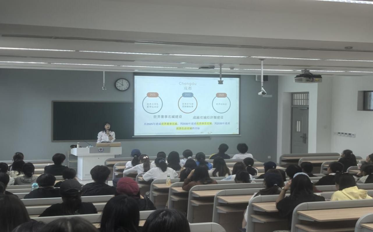 讲座中,李梦楚老师围绕 “服务体育赛事、培养复合型语言人才”的专业定位,结合自身参与2022年世界乒乓球锦标赛、2025年第十二届世界运动会、女子职业网球协会赛事总监以及国际篮球联合会3×3 U18世界杯等重大国际赛事申办及翻译的经历,分析了不同运动项目的价值与意义。随后,李老师介绍成都“世界赛事名城”的赛事资源,讲解双语志愿者选拔流程,并对实用英语、学术英语两大板块的学习提出很好建议,鼓励新生积极参与赛事实践。