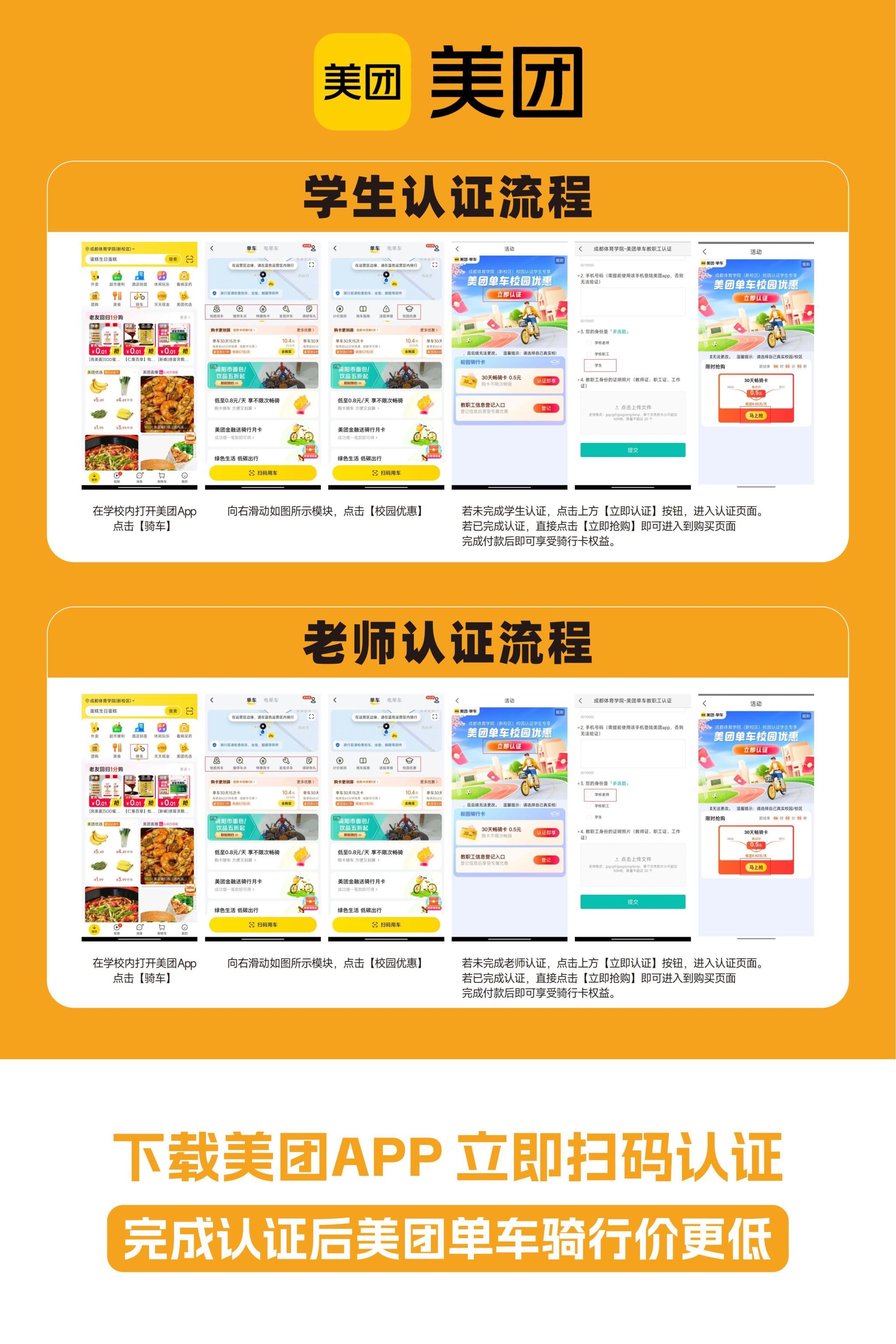 为方便师生出行,学校已引入美团共享电单车和自行车。师生需在自主认证后,方可购买美团公司投放至beat365的优惠价格。共享电单车单次:1.4元,共享电单车月卡29元,共享自行车单次:0.5元,共享自行车月卡0.5元认证操作如下: