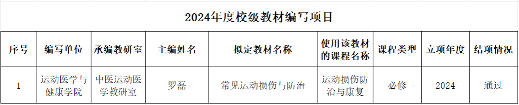 根据《关于开展2024年校级教材立项申报工作的通知》的要求,经项目负责人申请、院系审核、学校组织专家评审等,此次组织验收2024年立项的1部校级教材《常见运动损伤与防治》。验收结论为:通过验收。