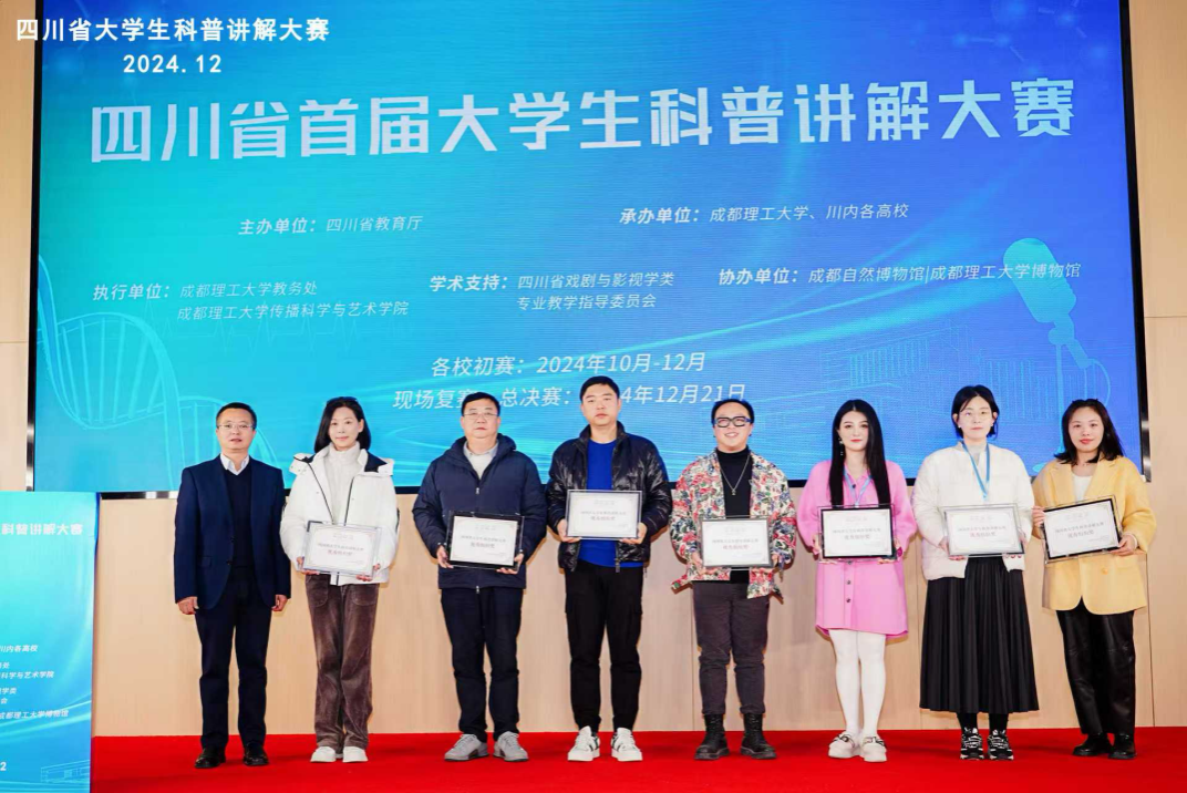 12月21日,由四川省教育厅主办、成都理工大学承办的四川省首届大学生科普讲解大赛在成都自然博物馆、成都理工大学博物馆举办。由新闻与传播学院选派的2023级播音与主持艺术专业学生熊羚好、李昱涵获得专业组三等奖的佳绩,beat365获得优秀组织奖。