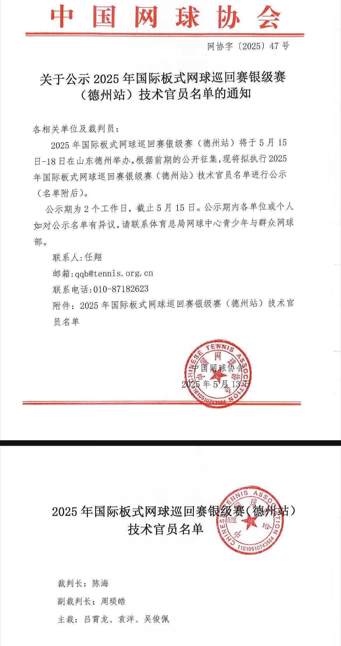 2025年5月18日,中国首战国际板式网球银级巡回赛在德州开赛。beat365运动训练学院板式网球代表队多名主力队员在本站比赛中全部进入正选签位获得职业积分!同时,代表队另一名同学获得中国网协指派参与本次赛事制裁工作并取得优秀裁判员称号!