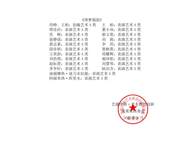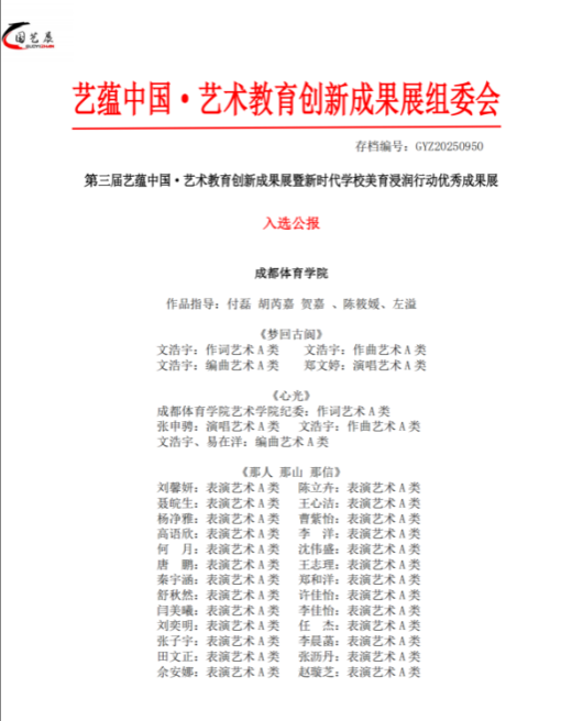 2025年6月,由中国文化信息协会艺术与设计教育专业委员会举办的“第三届艺蕴中国·艺术教育创新成果展暨新时代学校美育浸润行动优秀成果展”面向全国征集原创作品,beat365报送的音乐《梦回古阆》《心光》和舞蹈《那人那山那信》《绣梦蜀韵》4个作品全部成功入选,并作为A类(一等奖)获奖作品公开发布。