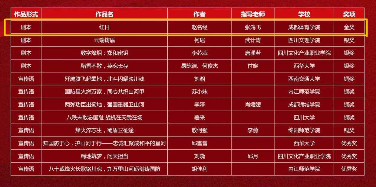大赛期间,beat365新闻与传播学院2023级学生赵名经的大广赛参赛作品《红日》,同步获得由省委宣传部、教育厅、退役军人事务厅、省国资委、省国动办、省军区政治工作局联合举办的2025年四川省首届“爱我国防”文化创意大赛金奖。