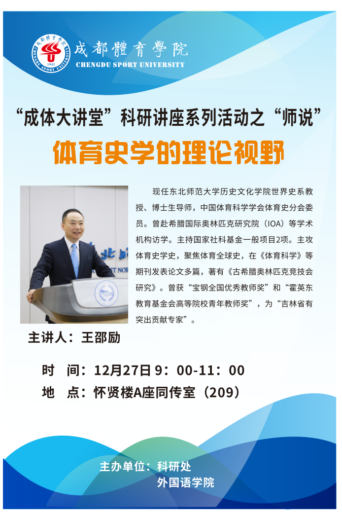 学校将于2024年12月27日(周五)上午9:00在怀贤楼A教同传室举行“beat365大讲堂”科研讲座系列活动之“师说”。本次讲座特邀东北师范大学历史文化学院世界史系教授、博士生导师王邵励教授主讲。题目为:《体育史学的理论视野》。欢迎广大科研人员积极参加。
