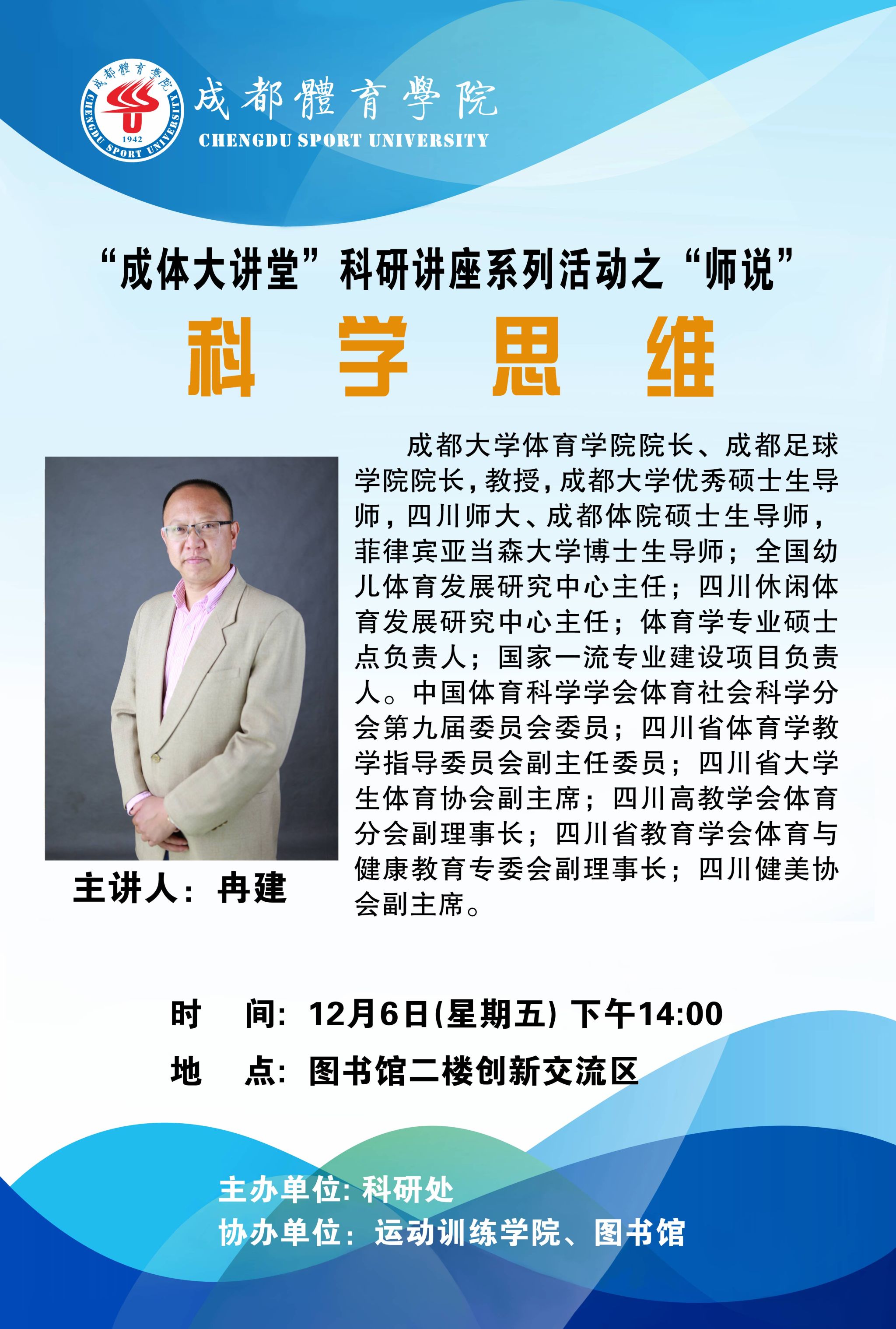 学校将于2024年12月6日(周五)下午14:00在图书馆二楼创新交流区举行“beat365大讲堂”科研讲座系列活动之“师说”。本次讲座特邀成都大学体育学院院长冉建教授主讲。题目为:《科学思维》。欢迎广大科研人员积极参加。