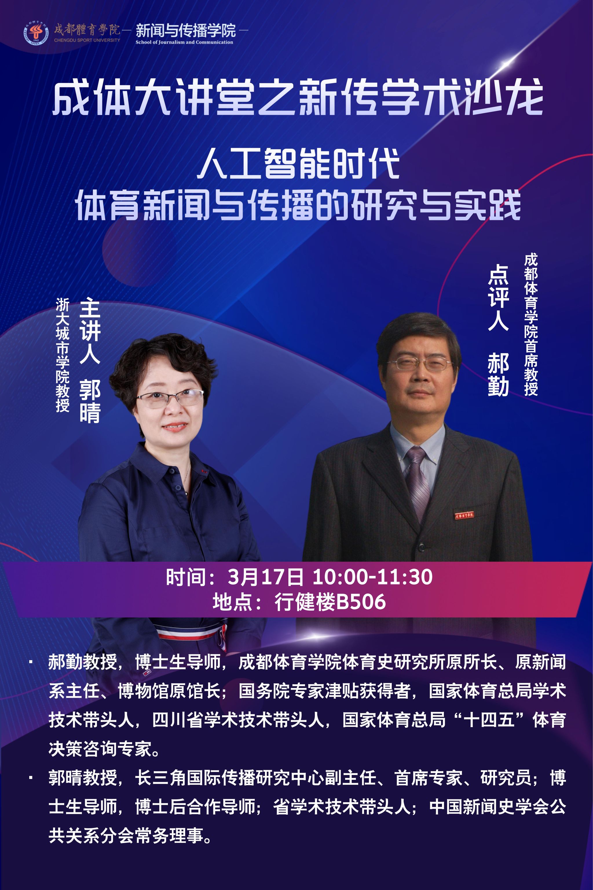 学校将于2025年3月17日(周一)上午10:00在行健楼B506举行“beat365大讲堂”系列活动之“新传学术沙龙”。本次沙龙主题为《人工智能时代体育新闻与传播的研究与实践》,特邀浙大城市学院郭晴教授主讲,beat365唯一官方网站首席教授郝勤教授点评。欢迎全校师生积极参加。