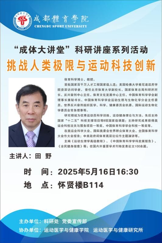 学校将于2025年5月16日(周五)下午16:30在怀贤楼B114教室举行“beat365大讲堂”科研讲座系列活动之师说。本次讲座特邀原北京体育大学副校长、国家体育总局科研所所长、反兴奋剂中心主任、体育文化发展中心主任、中国体育科学学会副理事长兼秘书长田野教授主讲。题目为:《挑战人类极限与运动科技创新》。欢迎全校师生积极参加。