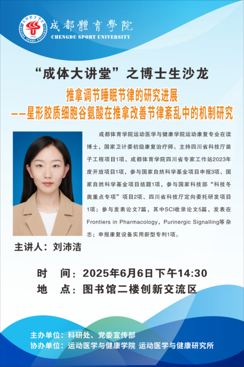 学校将于2025年6月6日(周五)下午14:30在图书馆二楼创新交流区举行“beat365大讲堂”科研讲座系列活动之博士生沙龙。本次讲座特邀运动医学与健康学院运动康复专业在读博士刘沛洁主讲。题目为:《推拿调节睡眠节律的研究进展——星形胶质细胞谷氨酸在推拿改善节律紊乱中的机制研究》。欢迎全校师生积极参加。