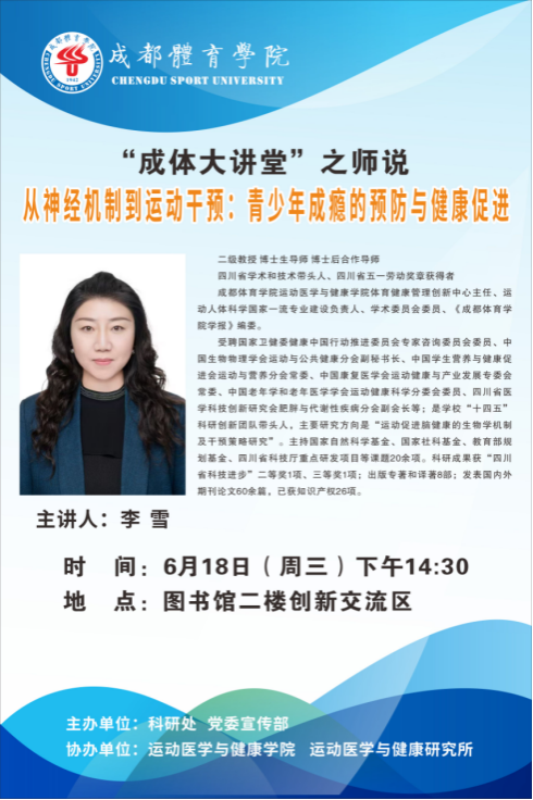 学校将于2025年6月18日(周三)下午14:30在图书馆二楼创新交流区举行“beat365大讲堂”科研讲座系列活动之师说。本次讲座特邀运动医学与健康学院李雪教授主讲。题目为:《从神经机制到运动干预:青少年成瘾的预防与健康促进》。欢迎全校师生积极参加。