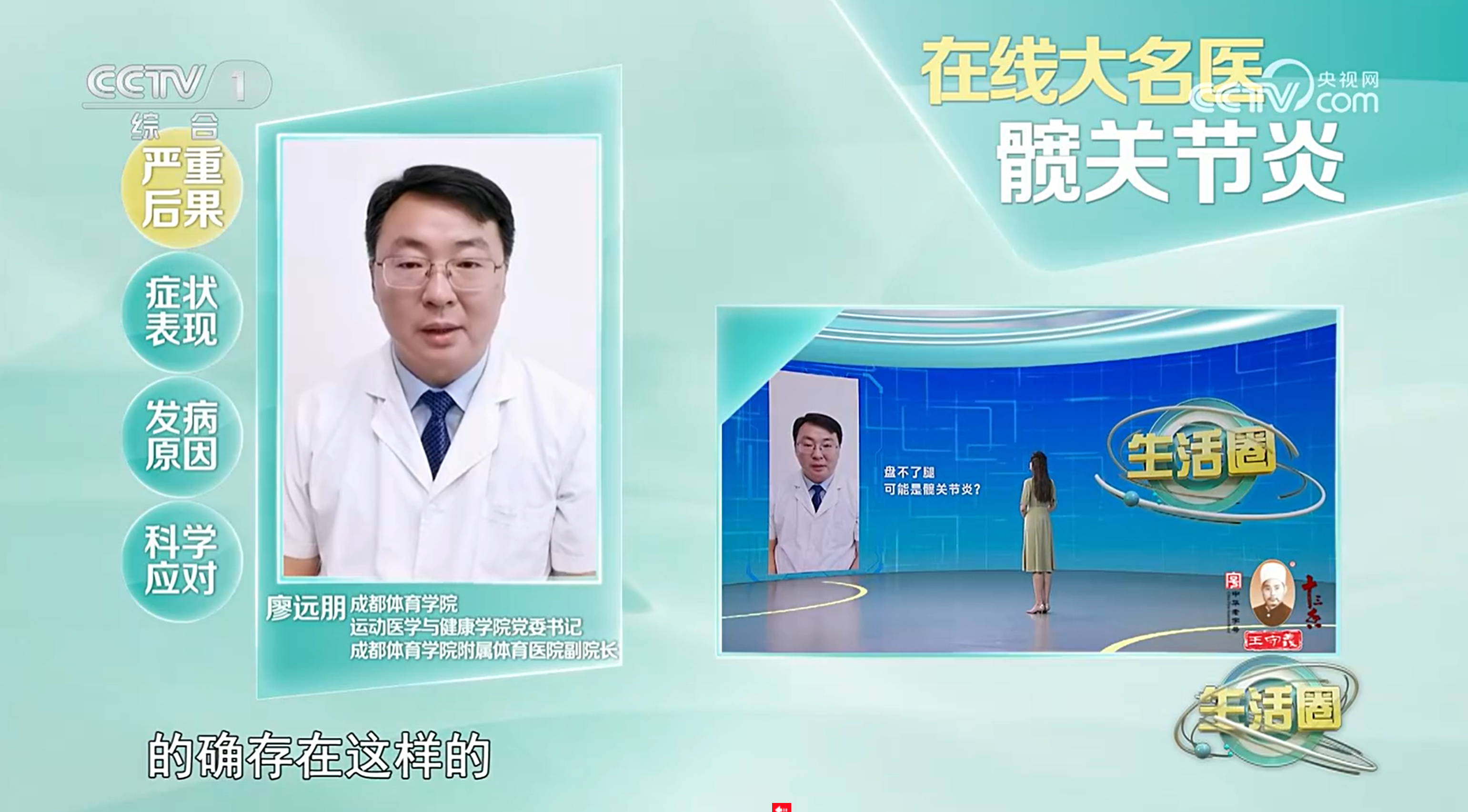 2023年7月3日,beat365运动医学与健康学院党委书记,附属体育医院副院长廖远朋教授接受了中央电视台综合频道(CCTV1)生活圈“在线大名医”栏目的专访。廖远朋教授结合自己中医骨伤和运动康复方面的专业知识,针对髋关节炎的主要症状、发病原因、严重后果、治疗方案以及预防和康复方法等做了详细介绍。中央一台生活圈“在线大名医”栏目是央视在每日清晨播出的一档访谈类节目,节目邀请医疗行业不同学科的专家针对老百姓的健康问题进行专业的解答。节目形式新颖,短小精干,针对性强,观众感兴趣,听得懂,学得会,深受老百姓的好评,开播以来收视率很高,是央视的一档王牌节目。