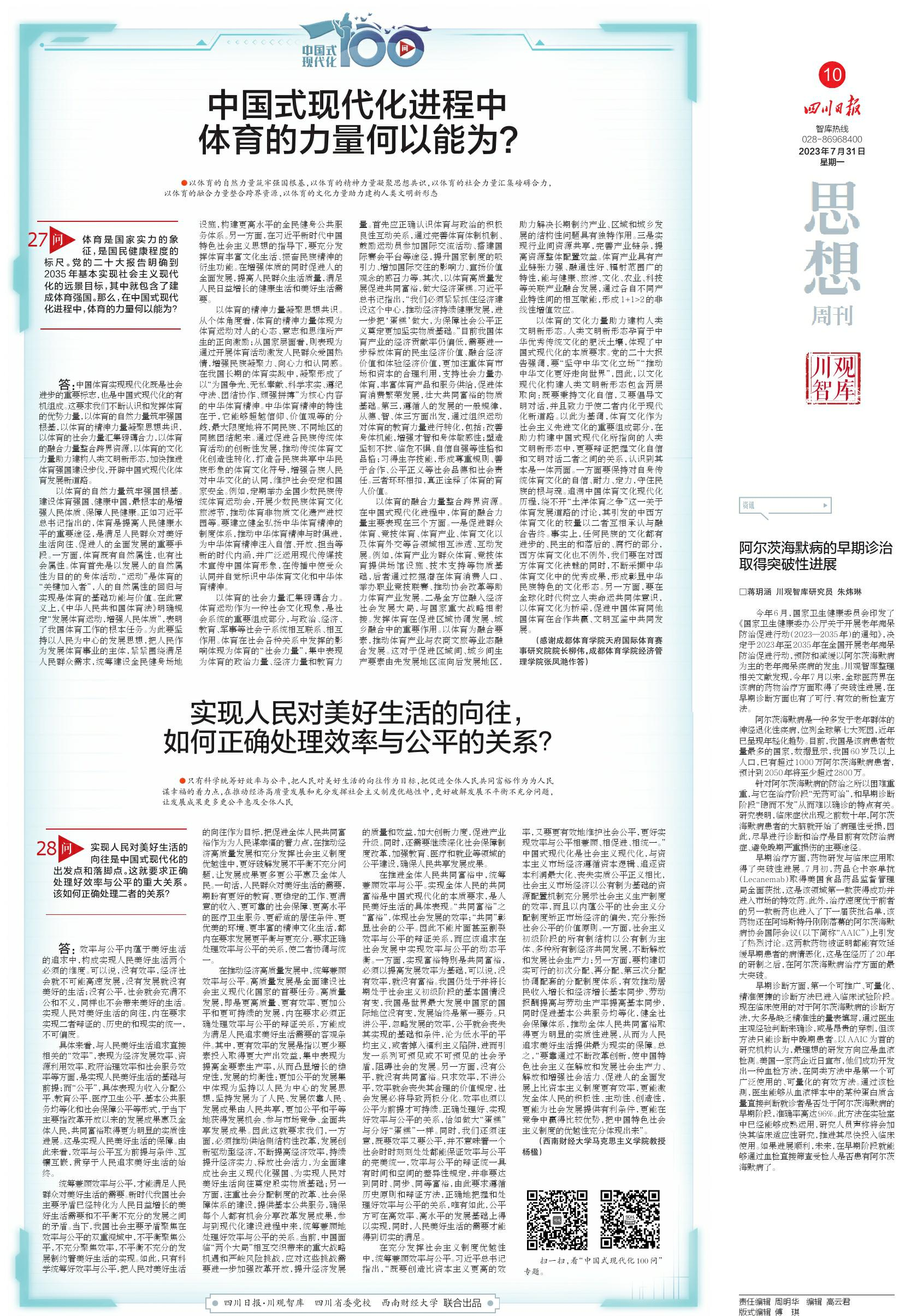 “中国式现代化100问”是四川省委宣传部指导、四川日报·川观智库联合四川省委党校和西南财经大学等机构推出的理论融媒产品、我省主题教育重点项目之一,将筛选关于中国式现代化的100个热点问题,邀请权威专家学者针对性回答,帮助广大党员干部在主题教育中更好学习把握中国式现代化的重大理论和实践问题。7月31日出版发行的《四川日报》(思想周刊)刊登了beat365教师天府国际体育赛事研究院柳伟和经济管理学院硕士研究生张凤滟为“中国式现代化100问”作答共同撰写的理论文章《中国式现代化进程中体育的力量何以能为?》,为推进学校主题教育走实走深,努力提高学习教育质量作岀了积极回应。四川政府网《川观新闻》同步进行了视频和文字报道。
