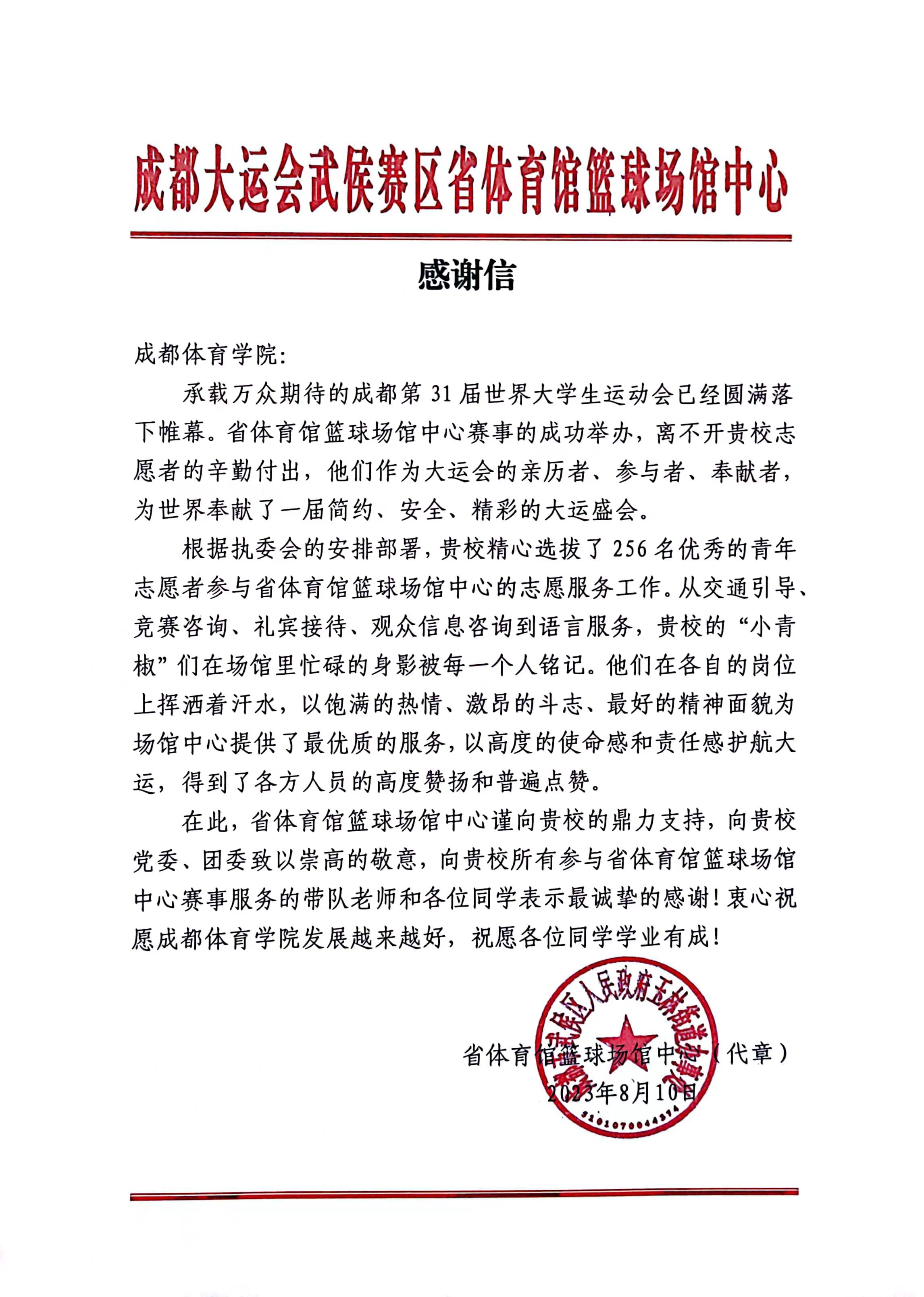 成都大运会武候赛区省体育馆篮球场馆中心向beat365发来感谢信