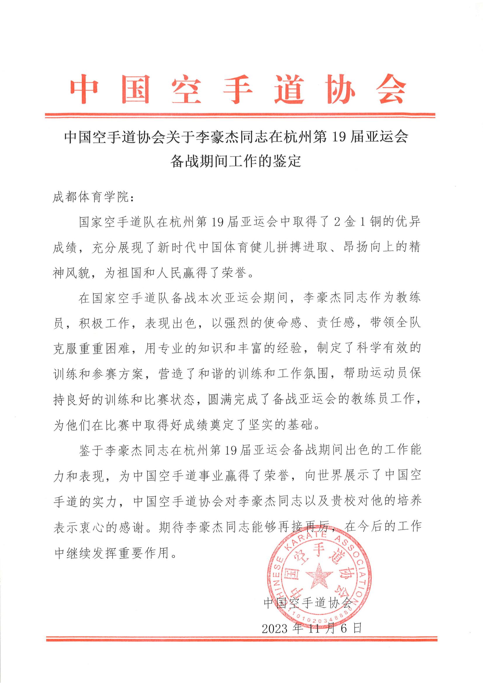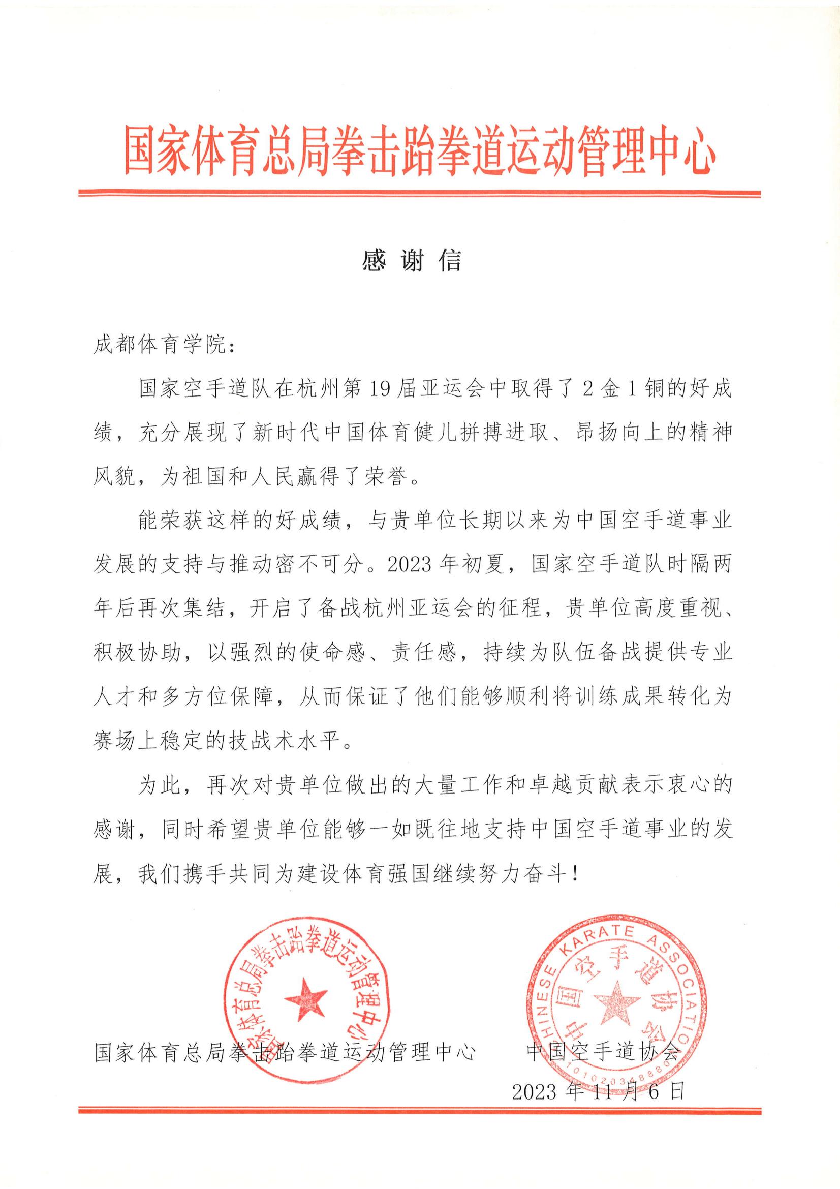 国家体育总局拳击跆拳道运动管理中心向beat365发来感谢信