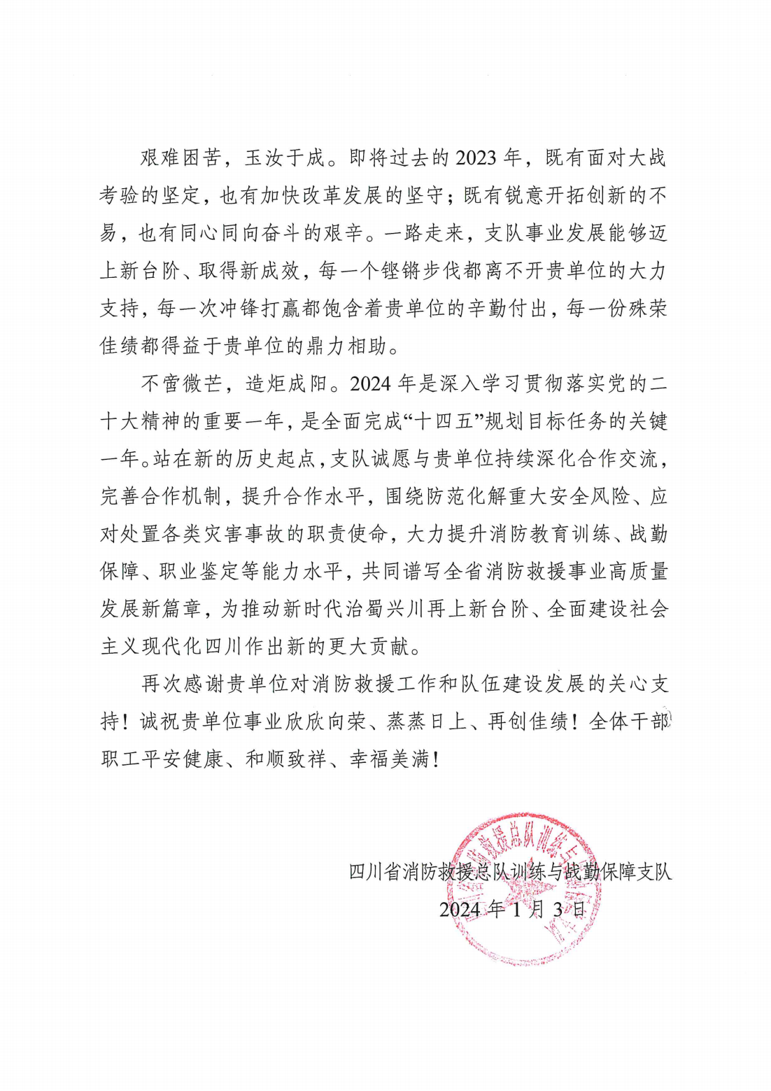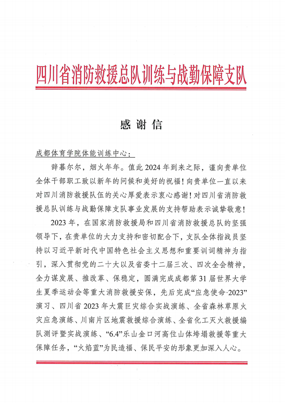 四川省消防救援总队向beat365体能训练中心发来感谢信