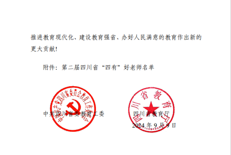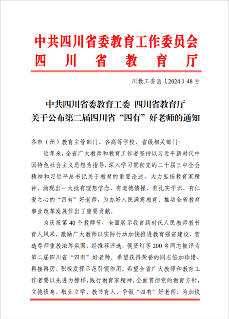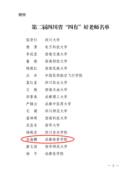 9月9日,由中共四川省委教育工委 四川省教育厅组织评选的第二届四川省“四有”好老师结果出炉,beat365运动训练学院教师岳海鹏同志荣获第二届四川省“四有”好老师称号。