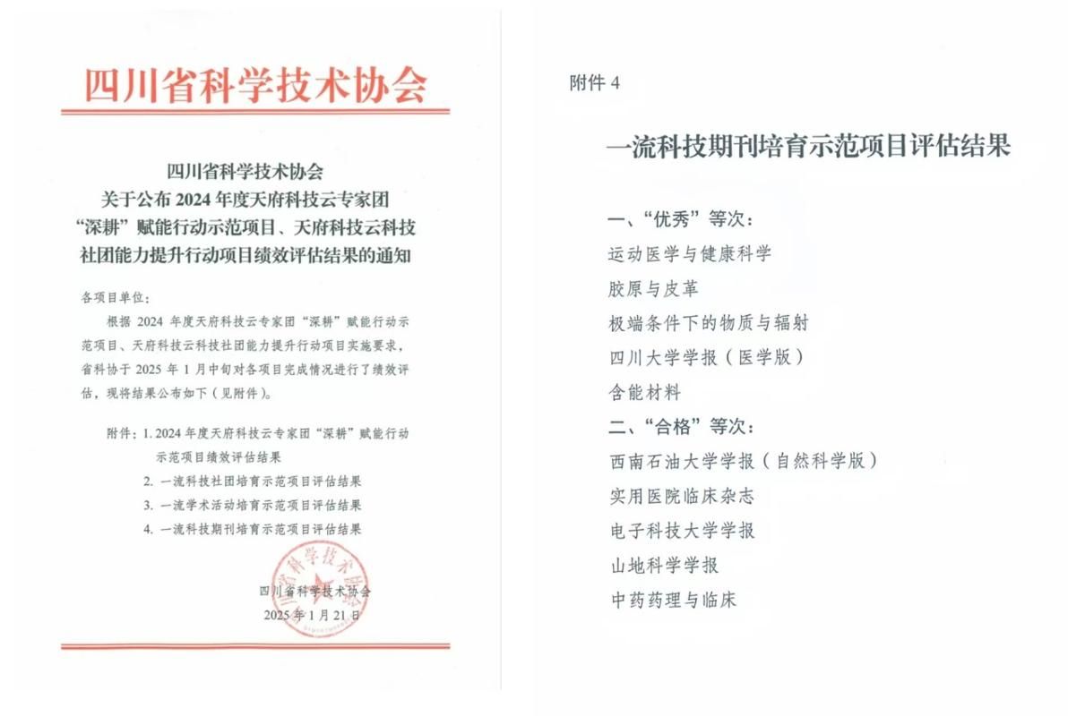 2025 年 1 月 21 日,四川省科学技术协会公布了2024年度天府科技云专家团“深耕”赋能行动示范项目、天府科技云科技社团能力提升行动项目绩效评估结果,《运动医学与健康科学(英文)》凭借这一年来的良好表现,成功斩获一流科技期刊培育示范项目“优秀”等级,这是对期刊长期以来在学术领域耕耘与创新的高度肯定。