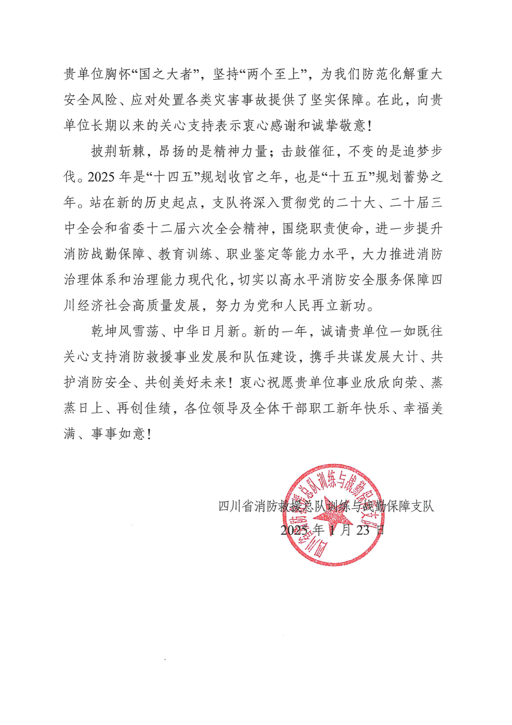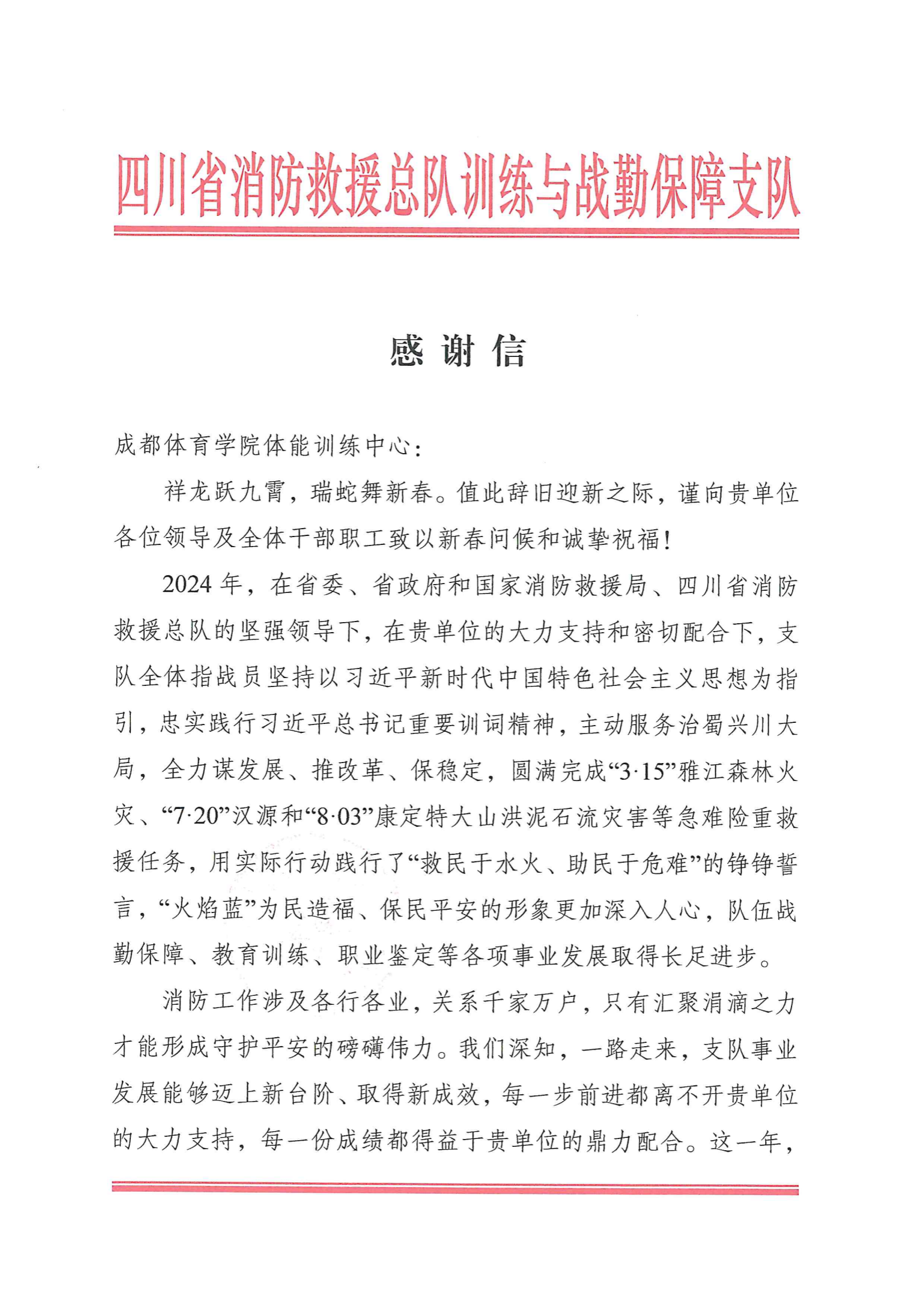 四川省消防救援总队向beat365体能训练中心发来感谢信