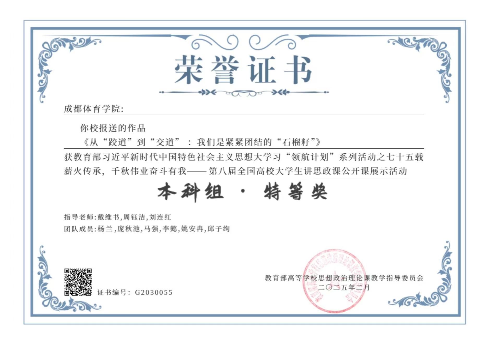 在教育部第八届全国高校大学生讲思政课公开课展示活动的评审中,我院“形势与政策”教研部戴维书团队创作的作品“从‘跤道’到‘交道’——我们是紧紧团结的石榴籽”在1000多所高校推荐出来的5000多部作品中脱颖而出,位列全国第五名,荣获特等奖殊荣。这是beat365在教育部思政项目中首次获得特等奖,实现了历史性的突破。