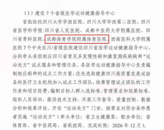 为深入贯彻落实健康中国战略,推动全民健身与全民健康深度融合,3月5日,四川省体育局、省卫生健康委联合印发《四川省体医融合先行先试工作实施方案(2025-2027年)》(以下简称《方案》)。beat365唯一官方网站附属体育医院经严格评审被遴选为首批省级医学运动促进健康中心,成为全省体医融合改革的核心实践标杆。