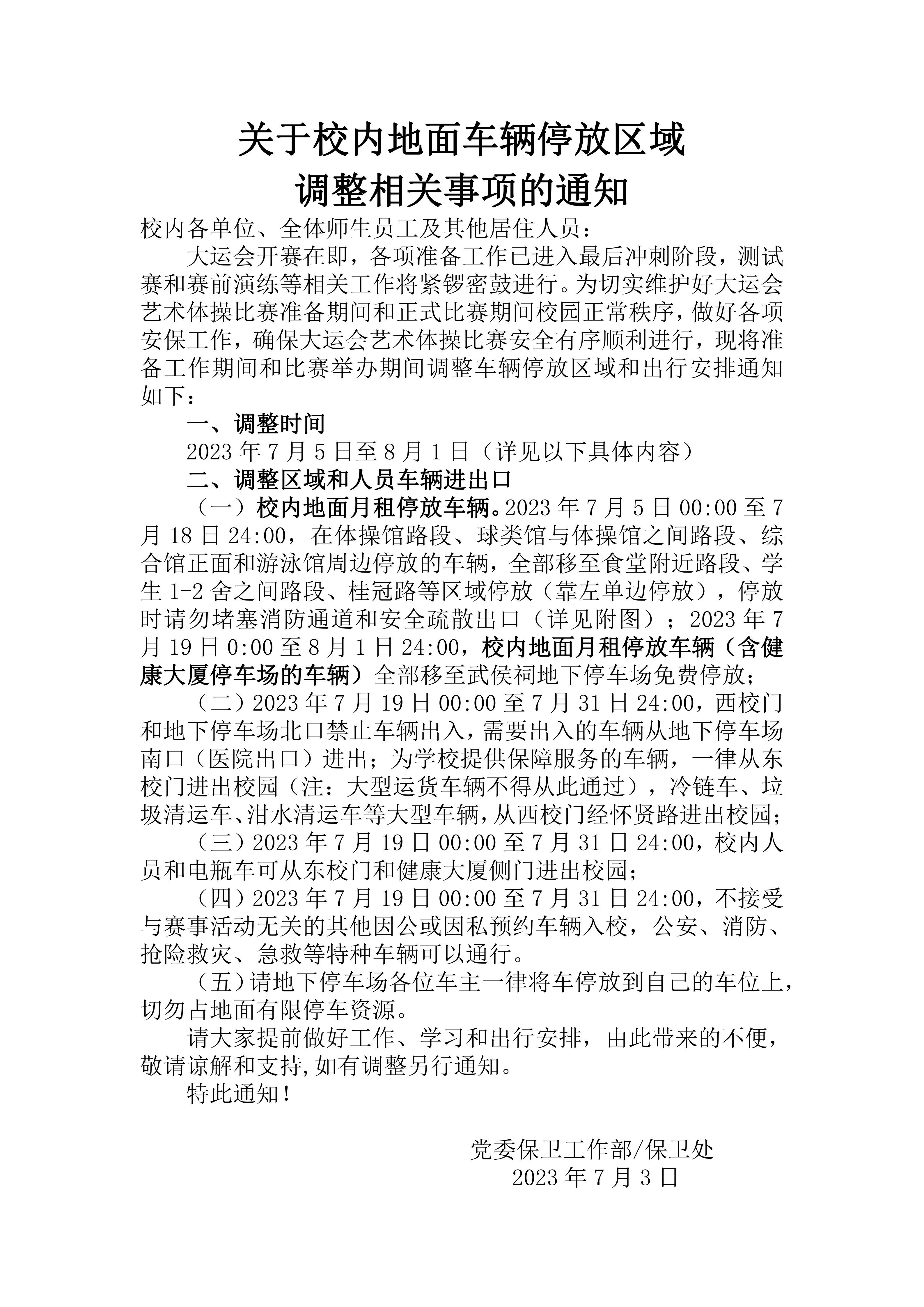 关于大运会前期准备和正式比赛期间校内地面车辆停放区域调整相关事项的通知