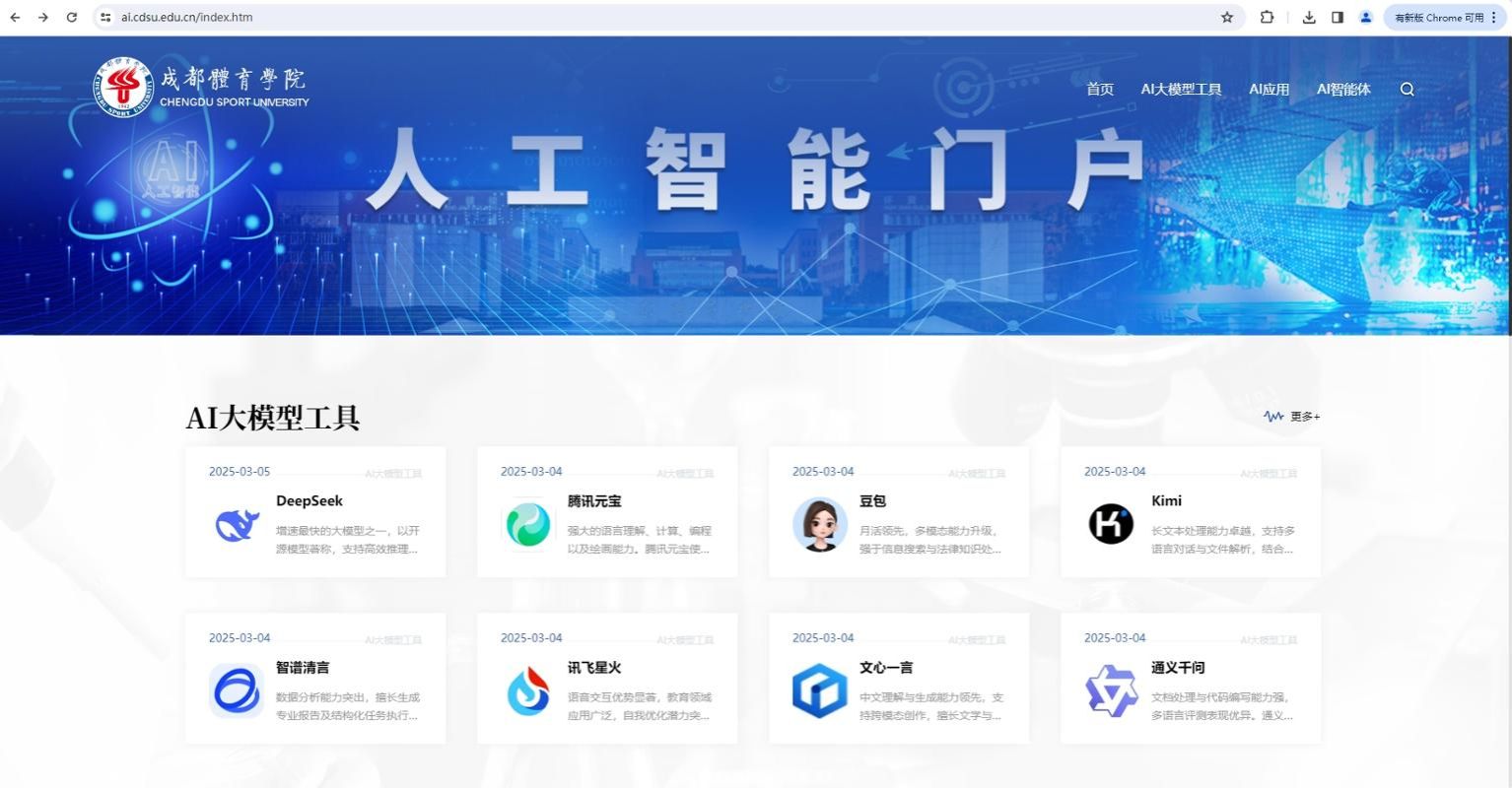 积极构建人工智能校园门户,其涵盖AI大模型工具、AI应用、AI智能体和AI相关分享。AI大模型工具推荐了目前国内主流的AI大模型(DeepSeek、腾讯元宝、豆包助手、Kimi、智谱清言、讯飞星火、文心一言、通义千问、天工AI),以充分满足各类应用场景的多元化需求;AI应用提供了人工智能应用软件下载和使用帮助服务,让师生便捷的获取各种人工智能软件;AI智能体涉及教育教学、科学研究和管理服务等方面,如辅助文章撰写、自动生成PPT等,有效提升师生教学、科研和办公的效率;AI相关分享总结人工智能相关术语和应用介绍等,让师生掌握更多人工智能前沿知识和技术应用。AI使用指南详见附件3。