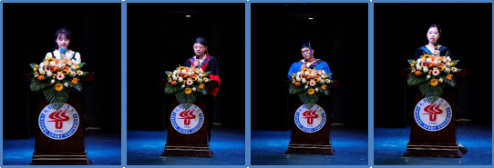 博士毕业生代表程亮、硕士研究生代表胡世亮、本科生代表中医学专业宋其璇分别发言。他们分别回顾了在母校学习、生活的点滴过往,表达了对老师、对母校的深深眷恋和感恩,以及从不同的侧面表达对未来的无限憧憬,表示将秉承“行健不息,积健为雄”的校训继续前行。在校生代表朱雅妮在发言中,表达了对学长学姐深深的祝愿。