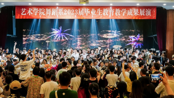 晚会尾声部分,艺术学院全体教师的毕业寄语视频表达了老师们对同学们的不舍与嘱托,同学们纷纷留下感动的泪水。随后学校领导和艺术学院的老师们走上台与同学们亲切握手、挥别,将现场气氛推向高潮。晚会赢得了现场观众一次又一次热烈的掌声和喝彩。舞蹈系2023届毕业生教育教学成果展演成效赢得学校领导和老师们的广泛认同和赞誉。