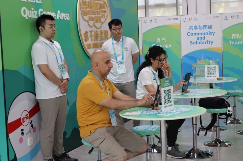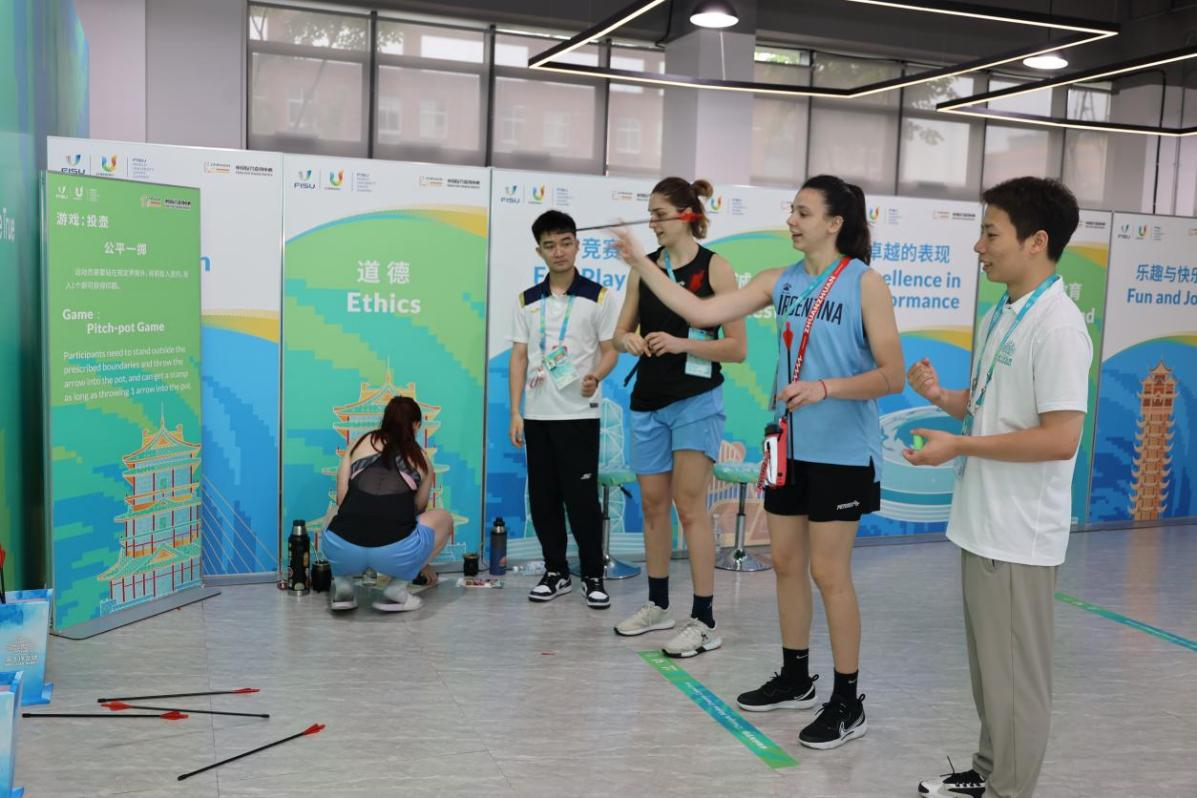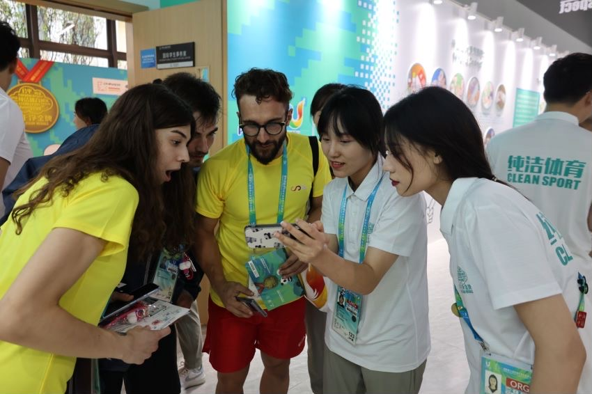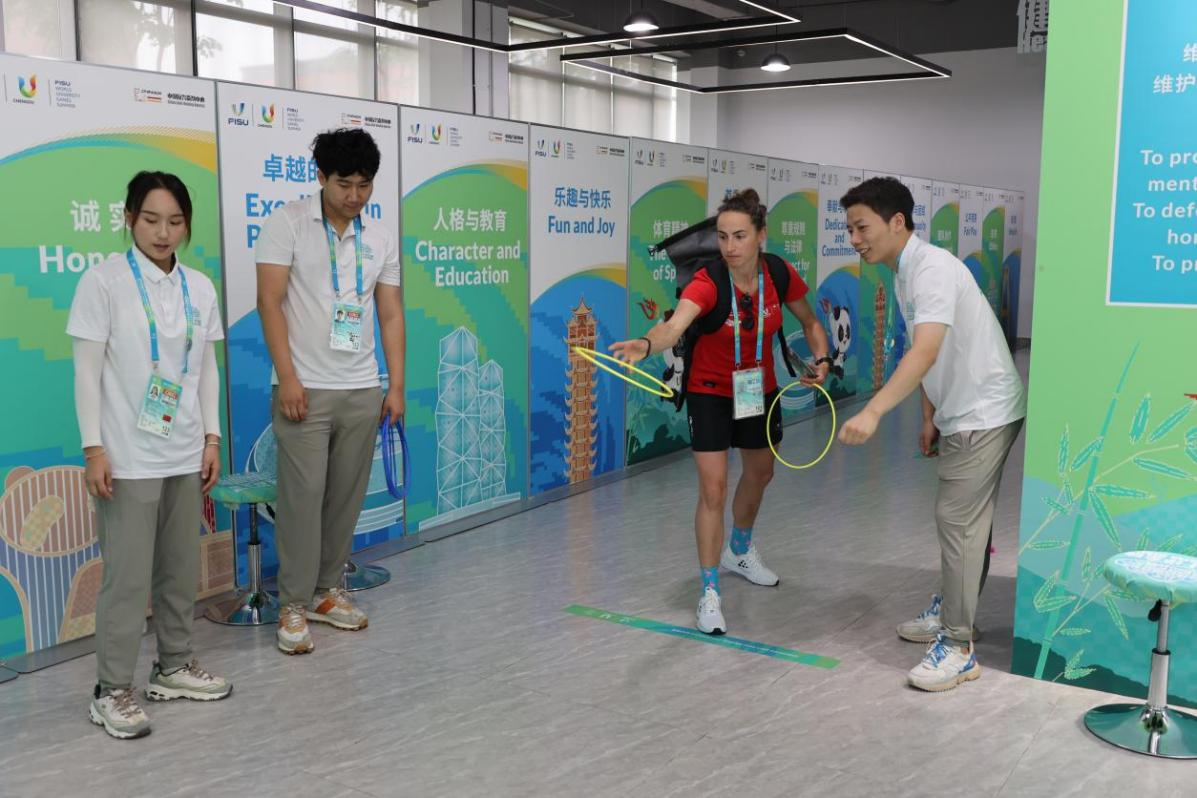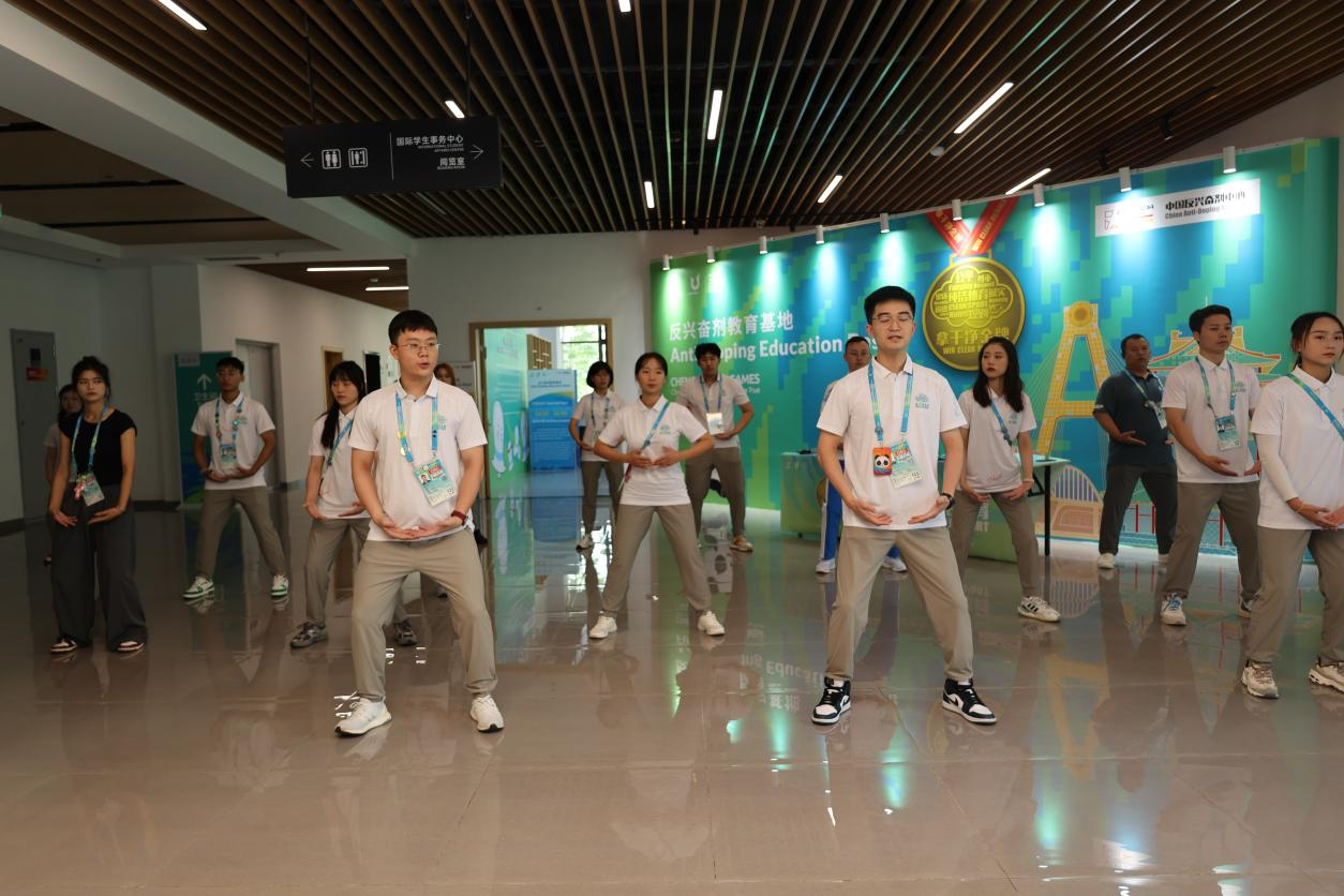 武术学院师生在反兴奋剂教育拓展基地的活动现场,以饱满的工作热情,与来自世界各地的运动员交流体育文化,普及反兴奋剂知识,充分展现了beat365人的活力以及武礼武德精神,为此次世界大学生运动会助力!