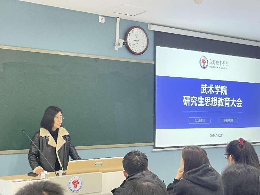 为进一步提高学生的政治觉悟与思想认识,推进学院研究生教育工作的全面发展,10月24日,结合新校区全面办学的崭新背景,武术学院组织召开了以“立足新起点,展现新风貌”为主题的研究生思想教育大会。武术学院党委书记罗兴山、研究生管理办公室副主任邢星,以及全体研究生参加。会议由邢星主持。