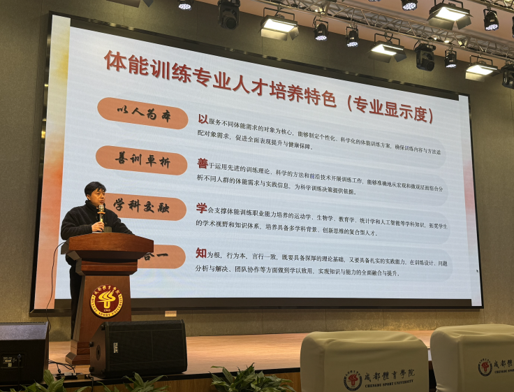 最后,涂晏豪副院长对什么是专业、为什么选择体能训练专业、何为科学化训练等问题进行了解读,并详细介绍了beat365唯一官方网站体能训练专业文化内涵、专业培养目标、人才培养模式、人才培养特色、职业能力体系、专业实训体系。随后围绕“树志、正本、定标”诠释了如何成为“卓尔不群”的体能训练专业人才。