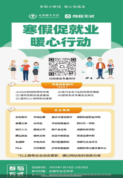 为进一步优化就业指导服务,帮助2025届毕业生解决求职就业中的急难愁盼问题,体育教育学院充分利用寒假窗口期积极开展“寒假促就业暖心行动”,多措并举营造浓厚的就业氛围,强化服务实效,切实帮助毕业生高质量充分就业。