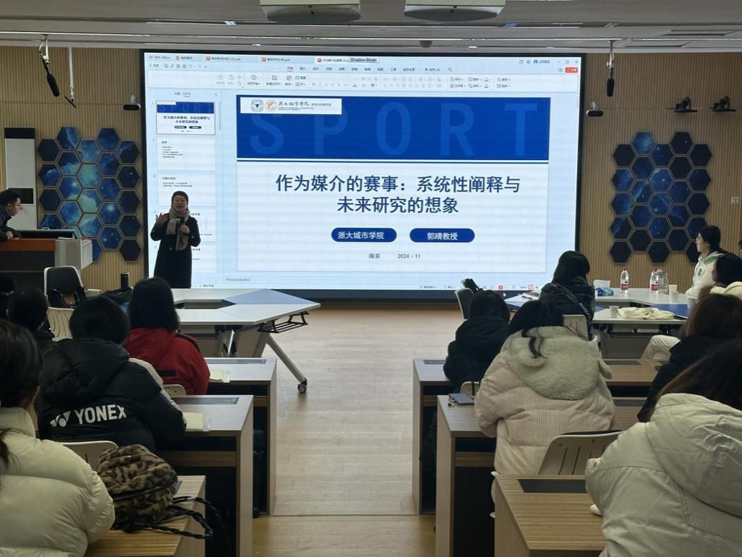 郭晴教授首先从自身的学术际遇入手,向同学们介绍了什么是体育传播、什么是体育赛事研究。随后,郭教授从词源学角度梳理了媒介的含义,继而讲述了“媒介意味着关系和联结”“媒介形成了环境和社群”一系列理论,接着引出关于“赛事即媒介”的话题讨论。郭教授表示,以“媒介”为起点,可阐释出赛事对生活、环境、文化的影响和建构,在此基础上,郭教授还围绕“体育赛事未来研究”展开阐述。讲座最后,郭晴教授结合AI的发展对体育新闻研究的实践方向提出建议。