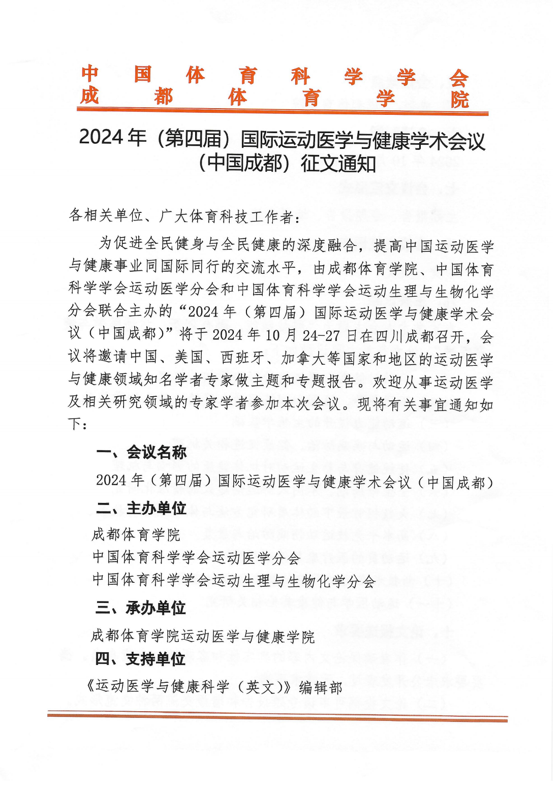 2024(第四届)国际运动医学与健康学术会议(中国成都)征文通知